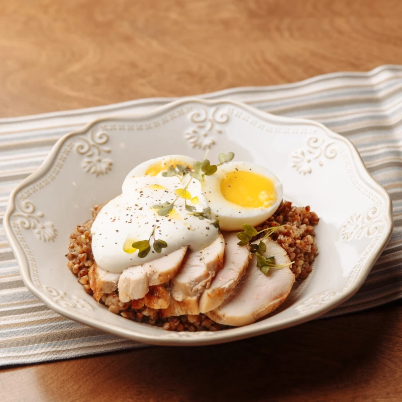 Суточная греча с цыплёнком и яйцом пятимянутка